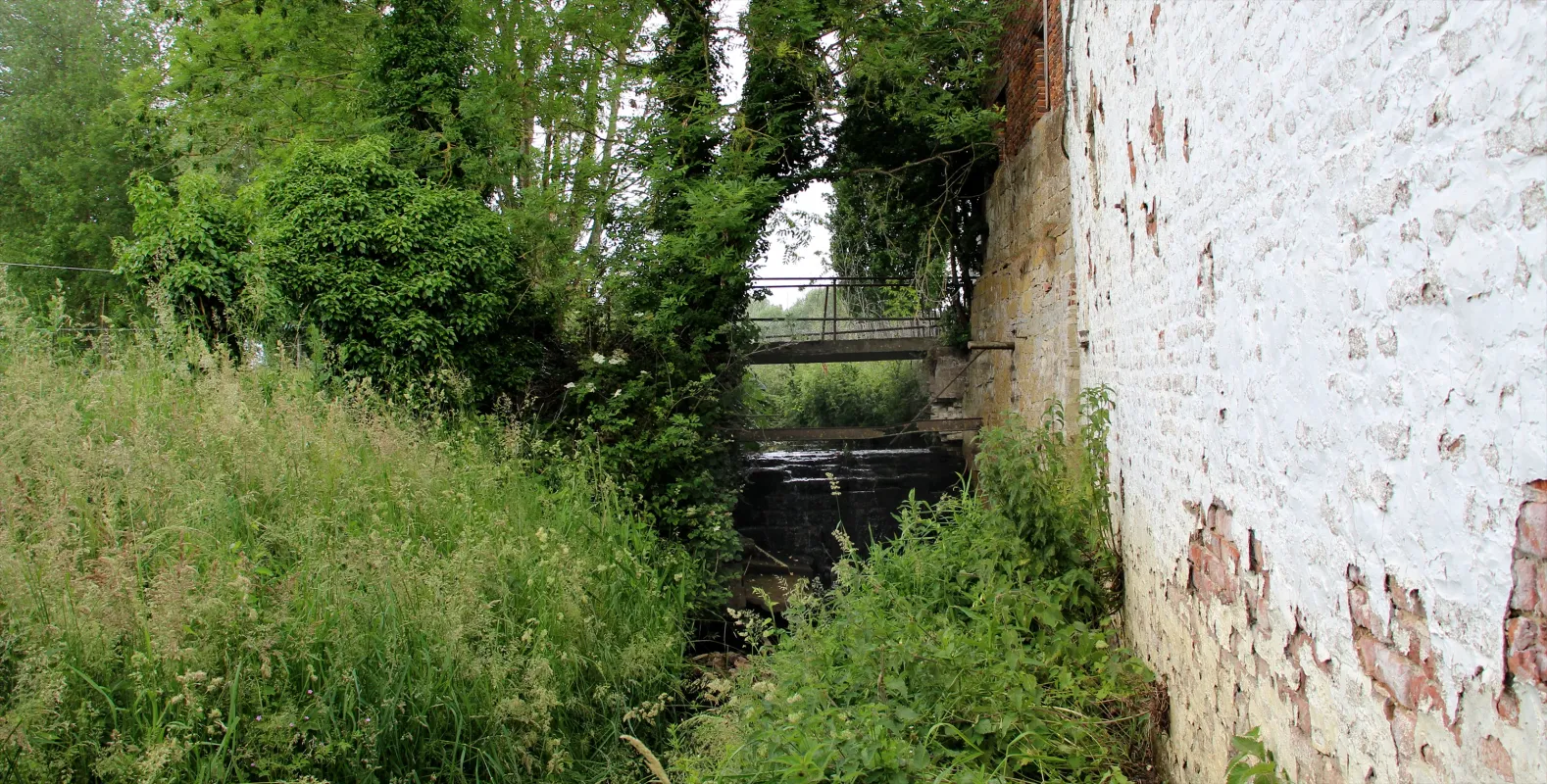 Klein rechthoekig gebouw onder zadeldak (pannen voor- en golfplaten achterdakschild), wellicht nog deels opklimmend tot minstens 16de-17de eeuw. Watergevel (zuid) bewaart overwegend metselwerk van onregelmatige zandsteenblokken: hoge onderbouw met twee versnijdingen en hoekkettingen tot aanzet punttop; bakstenen metselwerk vanaf de onderdorpels van de vensters; brred zoldervenster in met platen beklede geveltop. Bakstenen westgevel bewaart een rondboogdeur in zandstenen omlijsting met kwartholprofiel; venster met houten latei en hardstenen onderdorpel. Afgebrokkelde natuurstenen strekdam, betonnen brug met buisleuningen. Sluiswerk verdwenen evenals het waterrad. Technische installatie met elektrische aandrijving, niet meer in werking sinds de jaren 1970. Steenbed vervangen door ijzeren liggers op gietijzeren structuur van kolommen verbonden door ring met regelbare taatspotten. Gietijzeren raderwerk en overbrenging. Drie steenkoppels met houten steenkisten en dito toebehoren. Twee houten meelgoten. Bewaarde houten galg. Luiwerk. Kuiser.