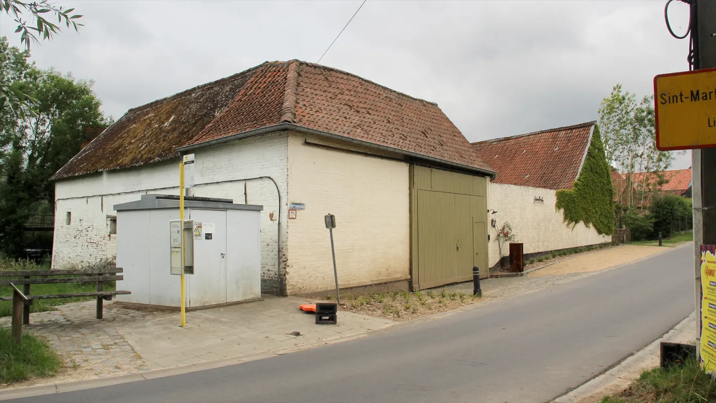 Ten oosten, aan de straat, overzolderde brede toegangspoort met doorrit; aansluitende lage stallen met uitzondering van straatgevel gesloopt. Ten westen, achterin gelegen boerenhuis van vijf traveeën, pannen zadeldak bewaart links een hoog houten zolderlaadvenster met katrol en schuif onder overstekende houten punttop. Gewitte erfgevel op gecementeerde plint met schijnvoegen. Aangepaste muuropeningen; rechts twee hoog geplaatste kleine opkamervensters. Binnenshuis sterk gewijzigd.
