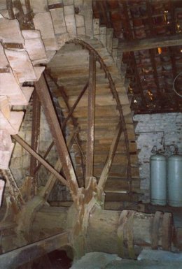- Overdekt groot ijzeren onderslagrad met houten schoepen