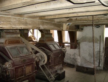 Twee koppels maalstenen (1 natuur- en één kunststeenkoppel) op de verdieping.