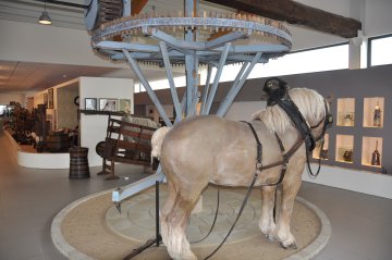 - een roskarnmolen, uitgerust met een groot, blauwgeschilderd spoorwiel en afkomstig uit Arnhem. Het paard liep binnen. Een levensgroot ingespannen kunstpaard verhoogt de didactische beleving.