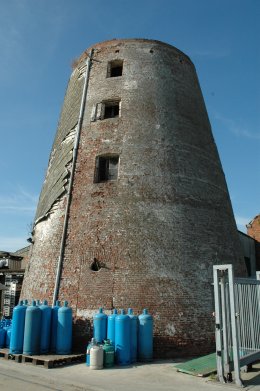 Bakstenen conische molenromp met plat dak. Sporen van een witte kalklaag aan de oostzijde sporadisch doorbroken door drie boven elkaar geplaatste luiken aan de linkerkant en deels bezet met eternietplaten aan de westzijde ter bescherming van de regen.