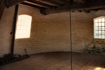 Vrij conische gewitte bakstenen molenkuip met drie bouwlagen, nu plat afgedekt. Begane grond met poort in oost- en westgevel onder eikenhouten latei en halfrond, opgevuld boogveld. Rechthoekige houten poort met twee vierkante getraliede deurlichten, vernieuwd naar bestaand model. Geschrankt geplaatste licht getoogde openingen op twee niveaus, ijzeren ramen met kleine roedeverdeling; nieuwe buitenluiken naar oorspronkelijk model.