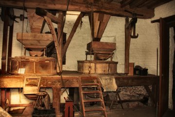 Op de begane grond, behouden maalinstallatie met frontale opstelling op lage houten maalvloer toegankelijk via een trapladder met vijf treden. Twee koppels rechtsdraaiende stenen (één koppel Franse en één koppel kunststenen van 1,50 m diameter), in houten steenkisten en houten meelgoten. Onderaandrijving door een elektrische motor (ASEA 1938) via een conisch gietijzeren raderwerk. Vervolgens staat er nog een kleine haverpletter, volledig in ijzer, bevoorraad van op zolder; met riemaandrijving van op de horizontale as.
