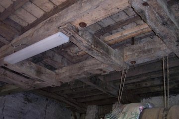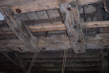 Binnen een ruimte van 8 x 9 m ongeveer bevindt zich aan de zoldering van het gelijkvloers een zware constructie bestaande uit 2 langsbalken waartussen zich 2 x 2 dwarsbalken bevinden.