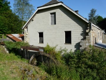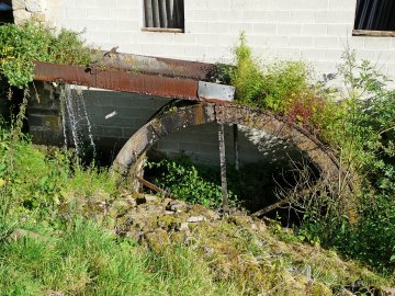 Het natuurstenen gebouw (de molen in het verlengde van het woonhuis) is nog in goede staat. Het metalen bovenslagrad is verroest.