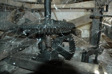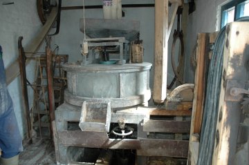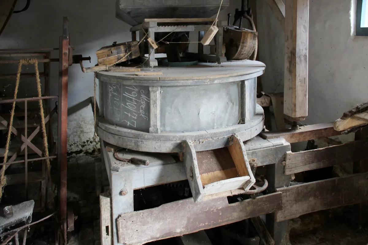 - Maalstoel met gietijzeren aandrijving, galg, slijpsteen