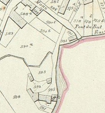 Op de Kadastrale Atlas P.-C. Popp (ca. 1860) vinden we deze "moulin à eau" op Sect. B 596 in het bezit van d'Arenberg, duc Prosper-Louis, propriétaire, Bruxelles.