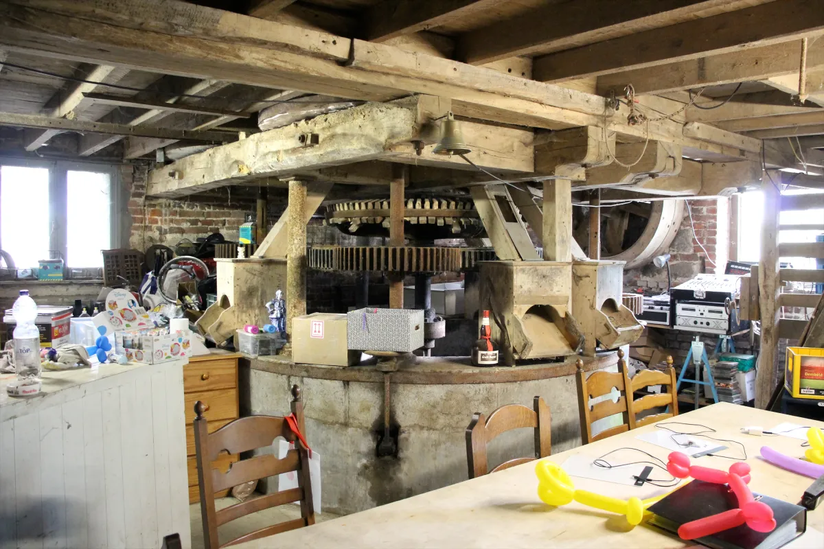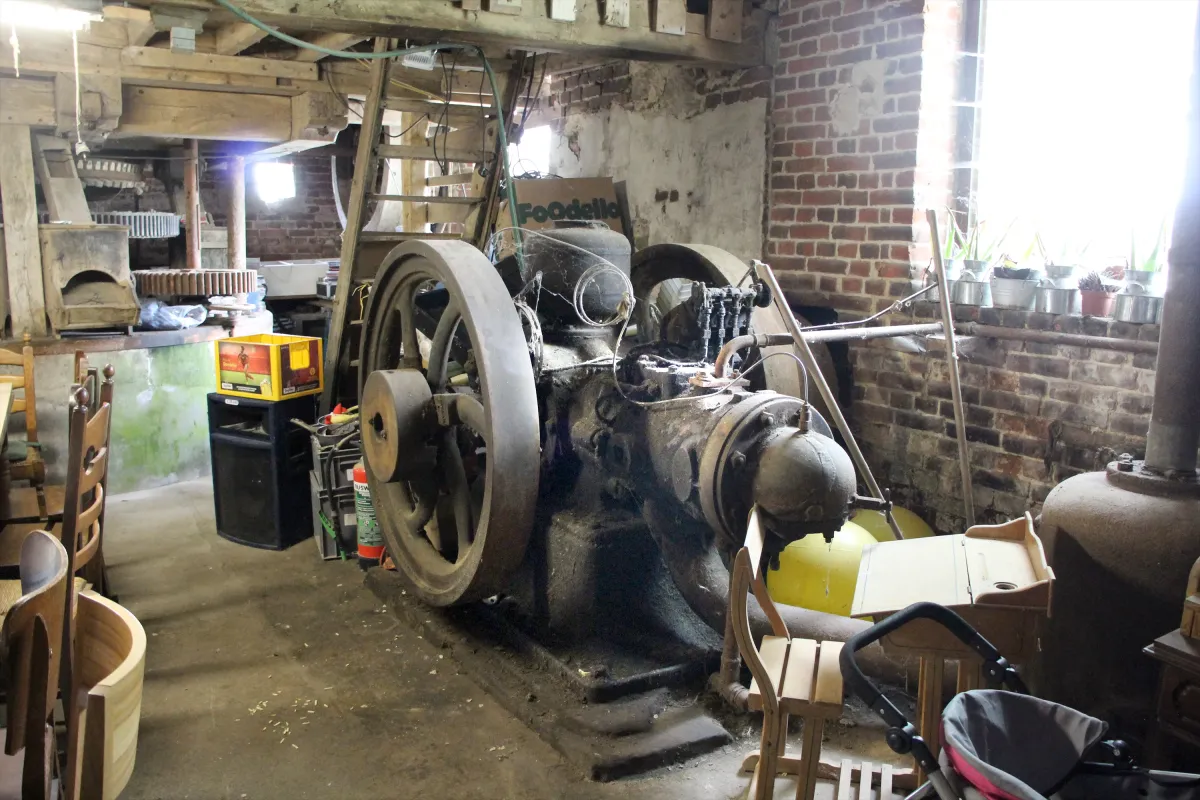 Bewaarde maalinrichting omvat drie steenkoppels (een Belgisch, een Engels en één getekend "Société Mulière Ferté-sous-Jouarre France"). Aandrijving met ijzeren raderwerk, wiel met drijfriem. Voorts omvat de installatie nog het luiwerk met rol, een galg, ijzeren haverpletter met houten bak, een elektromotor (een oude scheepsmotor).