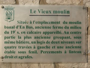 Situé à l'emplacement du moulin banal d'en Bas, ancienne ferme du milieu du 19e siécle en calcaire appareillé. Au centre partie la plus ancienne groupant, slous même batiére, un logis de deux niveaux sur quatre travées à gauche et une ancienne étable sous fenil. Percements à linteau droit et agrafes.