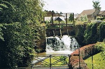 Vers l'aval, le barrage débouche, d'un côté, sur le canal d'alimentation du moulin et, de l'autre, sur un important déversoir.