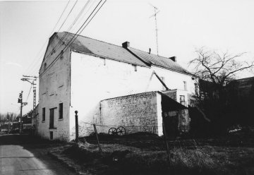 Le rez-de-chaussée est en moellons. A ce niveau, les baies sont encadreées de montants et de linteaux en calcaire. L'étage présente également les traces de trois ouvertures: une porte encadrée de deux fenêtres. La porte servait évidemmant au transbordement des marchandises. Le deuxième étage pésente la même structure avec un porte centrale et deux baies cintrées de part et d'autre, la porte centrale est surmontée des restes du dispositief du monte-charge. La différence de matériaux entre le rez-de-chaussée (moellons) et les étages (brique) pourrait trahir un rehaussement ou une reconstruction de la partie supérieure du moulin. Les façades du moulin sont très parcimonieusement éclairées. Côté cour, une porte à montants harpés trahit une construction probablement antérieure au 19e siècle et confirme l'impresssion que laisse le pignon. Initialement, une croupe terminait peut-être la toiture du côté de la voirie.