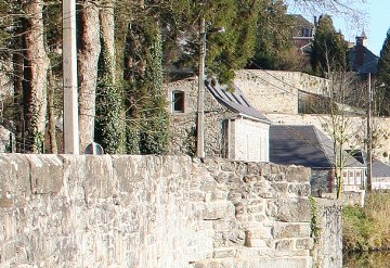 Edifié sur une dénivellation de terrain en amont du "pont romain", beau corps de logis de la 2e moitié du 18e siécle, en moellons avec angles en harpes de pierre calcaire. Un seul niveau à rue ave, à gauche, une porte à jambages en harpes sous linteau échancré à clé. A droite, trois fenêtres de même type. Boulins en briques, corniche de pierre profilée en cavet et bâtiére d'ardoises à coyau aux tuiles faîtiéres bien conservées, avec demi-croupes sur corniches de même profil. Au mur-mignon gauche, côté bief, fenêtres du même type qu'en façade réparties sur deux travées et deux niveaux. Baie de même structure au sommet du mur-pignon droit où s'ouvrent également, à hauteur de la façade, une fenêtre à encadrement de briques en arc surbaissé avec jambages à deux harpes, et, plus bas, une fenêtre de même forme entiérement en briques. Haute façade sur cour probablement de même caractére. Dépendances récentes et sans trait particulier situées en contrebas.