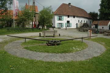 Eén tot maximaal vier paarden trokken telkens in een cirkel de trekstokken (hefbomen) voort. (Slechts twee van de vier stokken zijn geplaatst). De draaibeweging van het gietijzeren kransstuk werd omgezet op een lange wentelas die op zijn beurt een dorsmachine in de schuur aandreef. Deze as was in een goot aangebracht om het paard toe te laten gemakkelijk zijn ronde te kunnen afleggen.