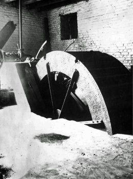 De familie De Wolf, eigenaar sinds 1863, heeft de maalderij nooit als dusdanig gebruikt. Zij heeft het houten waterwiel doen verdwijnen en vervangen door twee ijzeren, die naast elkaar, op elke oever van de beek, binnen in de instelling stonden. Ze werden gemaakt door smid Lemarcq uit de oude smidse bij 't Wit Paard en kostten 1500 Belgische frank per stuk. De molenstenen werden gebruikt om het blauwe kleurproduct indigo te malen tot poeder. De twee waterwielen hadden een verschillende bestemming. Het ene diende om te kalanderen (glanzen en uitstrijken van de stoffen) en het ander bracht pap- en verfmachines in beweging.