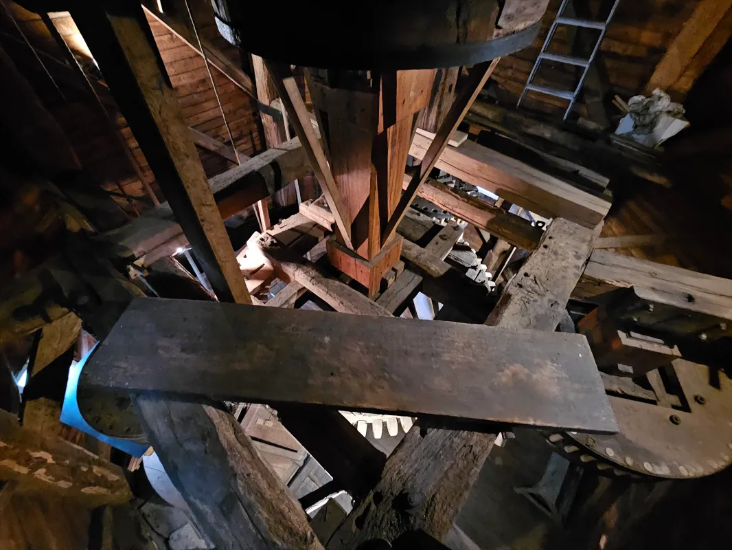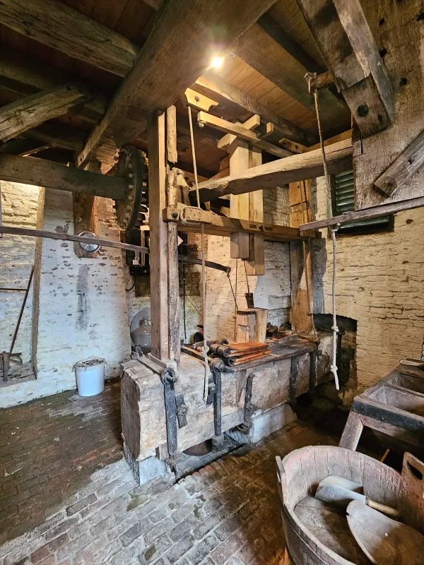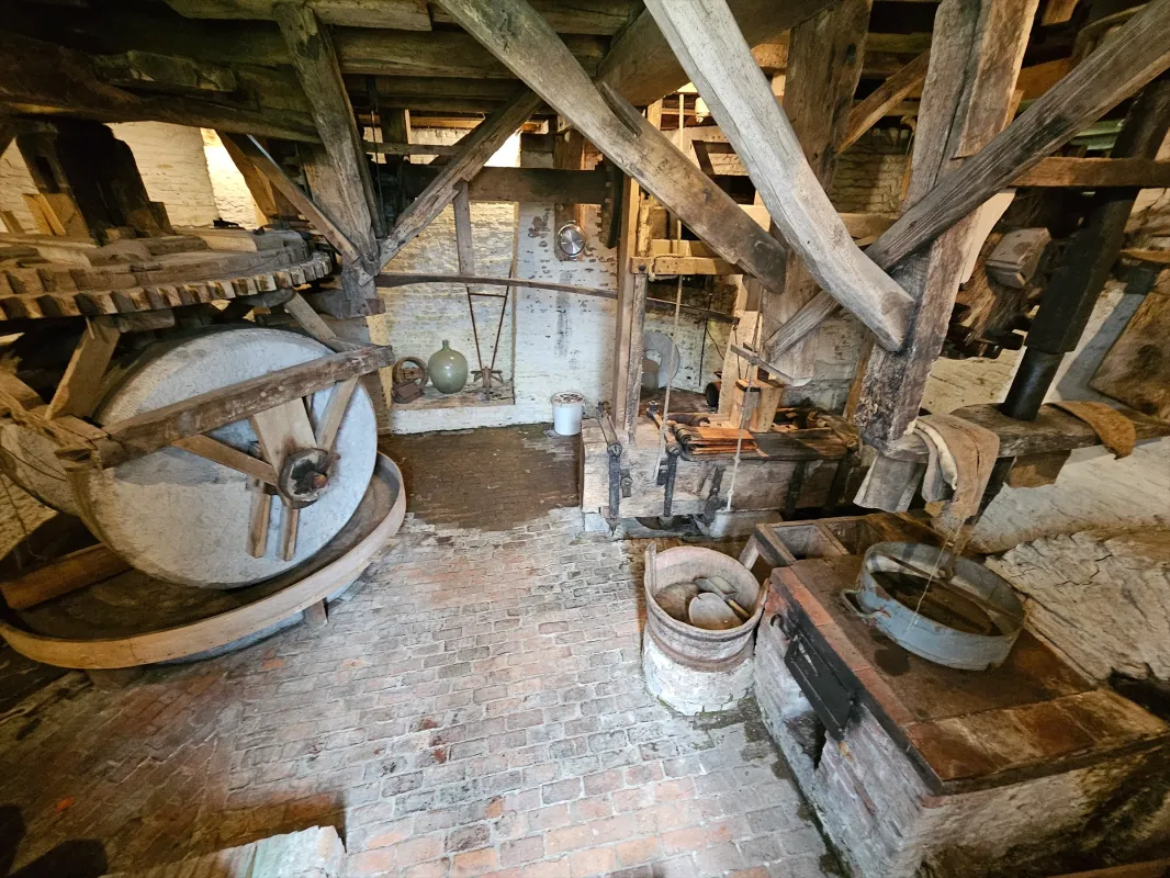 - Twee koppels kunststenen 1,6 m en 1,4 m met concentrisch zwaaipandscherpsel; kollergang van blauw arduin (diameter kantstenen 1,5 m), eiken slagbank 2,6 m. Overbrenging: 1 op 5.