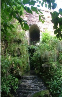 Le moulin du château, transformé en habitation et la chute d'eau issue de l'étang-douve du château qui alimentait la roue du moulin