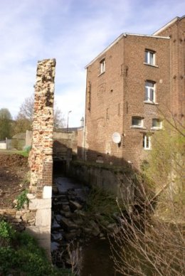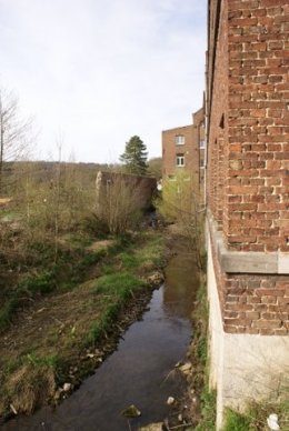 Les deux éléments du barrage du Val Notre-Dame sur la Méhaigne qui contrôlent l'entrée des anguilles dans le bassin à partir de la Meuse: le déversoir et le coursier de l'ancien moulin où devrait être installée une turbine hydroélectrique (Vis d'Archiméde).