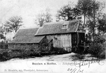 - 1816: 2 moulins à eau. (...) Le second n 'a qu'un tournant et sert à moudre le grain. Il est affermé et appartient à la Société des Moulins. Désigné à la section D n° 483 il est situé sur la grosse Nèthe et se trouve en bon état. Sa chute d'eau, qui est plus faible que celle du prmier moulin, cause certaines interruptions dans son service. Ce moulin est affermé au sieur Guillaume Willekens par acte passé sous seing privé à raison de 96 rasières de sigle ainsi que les contributions qui s'élèvent, d'après le rôle de 1813, à 217,05 fr."