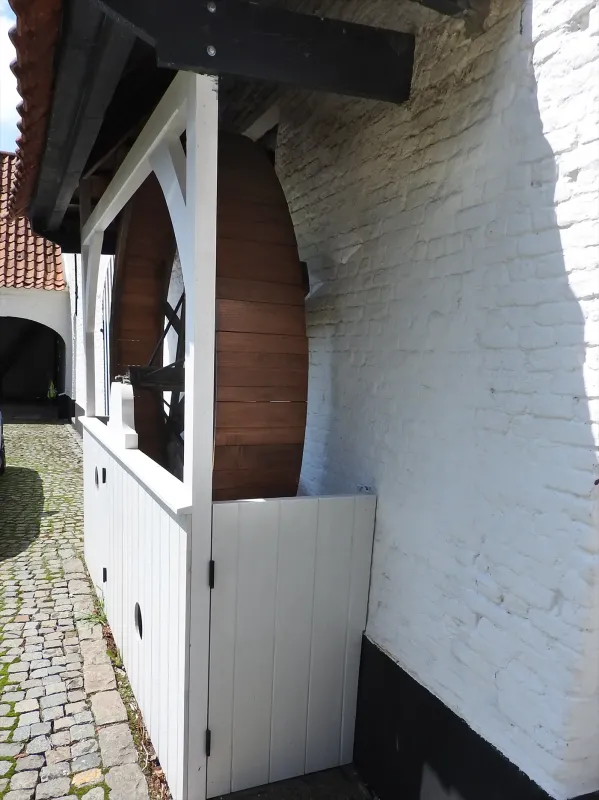 Op de binnenkoer van de Valkenhoeve werd tegenĀ de buitenmuur vanĀ een schuur een houten loopwiel gemonteerd onder een pannen schilddakje.