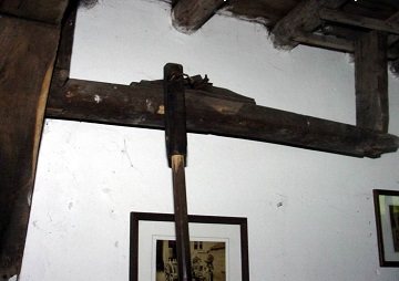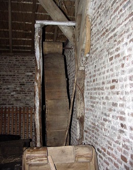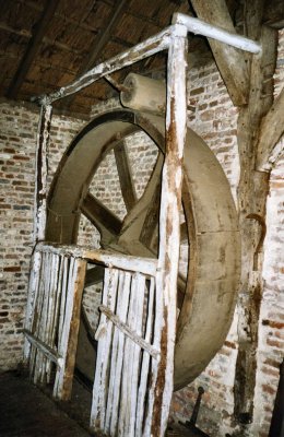 Het houten loopwiel staat binnen in de stal, heeft een diameter van 250 cm en een loopbreedte van 38 cm.