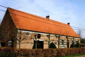 Op omhaagd terrein ingeplant woonhuis met rij linden vooraan en parallelle langsschuur ten noordwesten, uit het midden van de 19de eeuw. Verankerde bakstenen gebouwen onder pannen zadeldaken (nok parallel aan de straat). Woonstalhuis met lijstgevel van zeven traveeën en één tot anderhalve bouwlaag, afgelijnd door een bepleisterde en geprofileerde daklijst. Beluikte, rechthoekige vensters onder houten latei; licht getoogde deur en min of meer aangepaste stalling met rondboogvenstertjes bovenaan. Opkamer in noordelijke hoek. Rechtse zijgevel met luifel van het vroegere hijsmechanisme boven het voormalige laadluik. Tweebeukige schuur van vier traveeën.