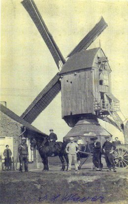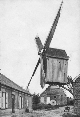 - ca. 1810: "un moulin à vent à farine. Il est affermé au sieur Melchior Van den Broeck avec un petit jardin et la superficie d'un bâtiment rural au prix de f. 350 avec les impôts et la charge d'entretenir les ouvrages tournants. Le bail en existant a pu servir de régulateur à l'estimation de cette usine. Le résultat de la ventilation a fait connaître que sa valeur locative brute était de f. 415,94 sur quoi déduisant le tiers pour les frais d'entretien et de réparations, il reste net f. 277,29. Mais attendu que ce résultat obtenu par cette ventilation, s'écarte de la présentation des évaluations définitives assignées aux usines de l'espèce dans d'autres communes ou des opérations cadastrales ont eu lieu, l'expert estime que celle du moulin dont il s'agit doit être en définitif réduite au taux de f. 250".