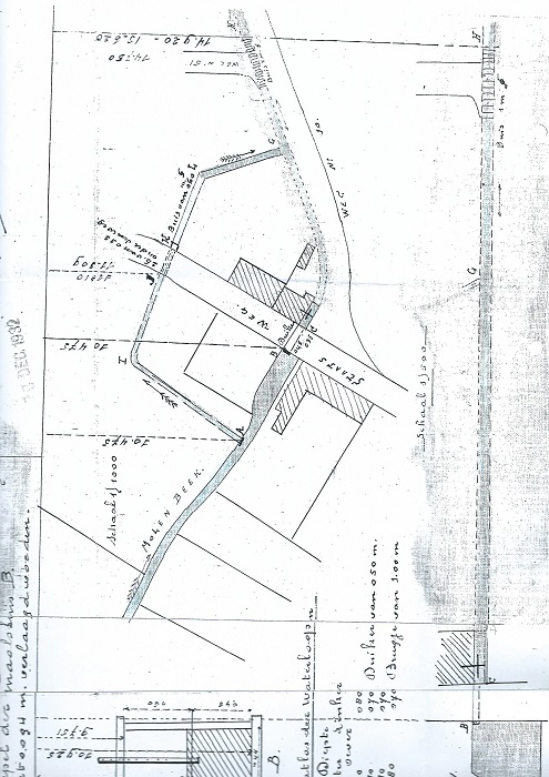 Provinciaal Archief Limburg te Hasselt, Plan voor de plaatsing van nieuwe peilnagels op de Dorpermolen te Lanaken, opgemaakt op 11 november 1931 door landmeter Jeurissen.
