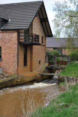 - Bakstenen gebouw, dwars op de waterloop