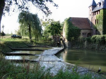 De eerste watermolen werd dus kort na1422 gebouwd, op een honderdtal meter van de bedding van de Oude Velpe. Daarna groef men 400 meter stroomopwaarts van de oude Velpe een kanaal, waardoor men kon stuwen en een waterval van zo'n 2 meter verkrijgen om het waterrad aan te drijven. De Ferrariskaart van ca. 1775 vertoont de twee waterlopen.