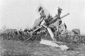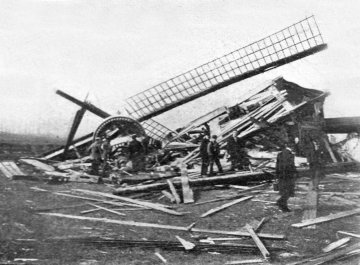 Aardig, hij stichtte geen brand maar deed uiteindelijk den molen instorten, den molenaar begravend onder zijne puinen. De molenaar is gevaarlijk gekwetst."