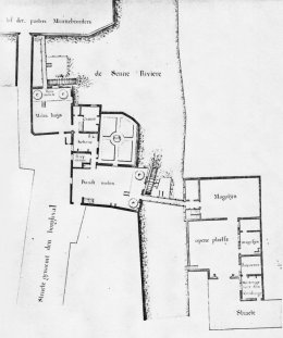 (12) Un excellent plan est conservé dans les dossiers des Travaux Publics (ib.),no 8068, démontrant en 1853 l'ensemble des locaux du moulin, roue, pont et Senne ain si que les dépendances, habitations du meunier par ex. Ce plan prouve à évidence que le Bantmoien s'étend sur les deux rives de la Senne. (Cf. fig.5.)