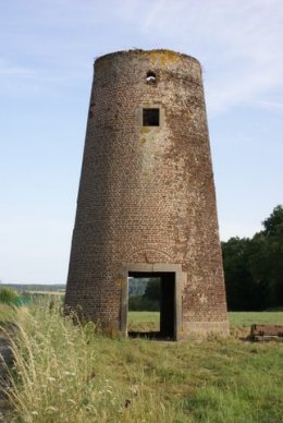 Moulin à vent en brique et pierre bleu circulaire et taluté. Ailes et toiture disparues. Dans l'axe deux grandes portes sur montants à double harpe donc le linteau droit déchargé par un arc important porte côte route. Deux fenêtres rectangulaires aux deux étages et petite baie cintrée en brique au sommet.