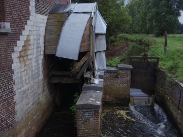 - Overdekt stalen waterrad met houten schoepen