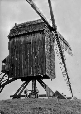 Onderaan stond molenaar Rufin Van Nuffel. Achter hem het houten juk dat hij op de schouder nam om de molen om zijn verticale spil in de wind te kruien. Later werd dit juk vervangen door een windas. De Van Nuffels hadden zelfs een systeem met windas en katrollen uitgewerkt zodat het mogelijk was, met de hulp van de wind de molen van bovenaan te kruien. Ook valt op dat de houten molenroeden uit twee stukken bestonden.