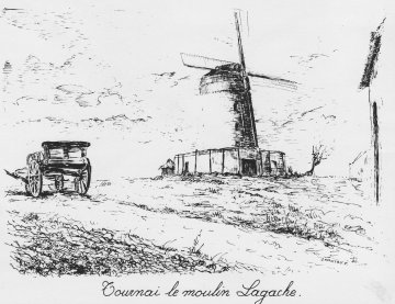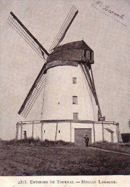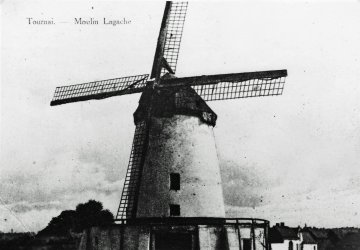 Le moulin Lagache se situait en bordure d'une voirie dite "Vieux Chemin de Willems", à la limite de Tournai et Froyennes, près de la plaine de jeux de "La Marmite" et le refuge de la Croix Bleue et de la ferme Lagache (encore existante et superbement restaurée). Le moulin se trouvait au bout d'une petite crête dominant la vallée de l'Escaut en même temps que le ruisseau dit "Les Rieux". Le secteur est connu sous le nom de "Champ des Moulins".