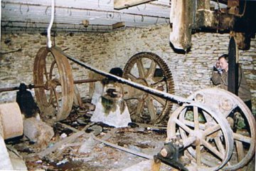 De as van het tandwiel bracht verschillende metalen vliegwielen op gang: één voor de verticale zaag, één voor de cirkelzaag, één voor de generator en enkele bijkomstige die misschien dienden voor de slijpstenen.