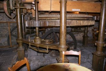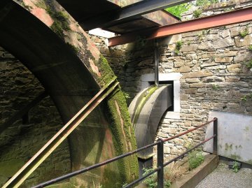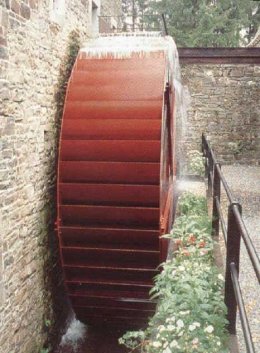 Tussen het waterrad en de achterliggende muur wordthet water tegenwoordig via een buizenstelsel naar een turbine geleid voor de opwekking van elektrische stroom.