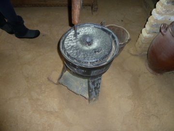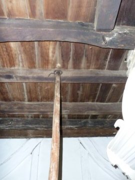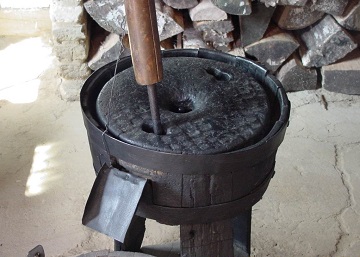 - Koppel mosterdstenen in houten kom met houten aandrijfstang, vastgehecht aan de zoldering