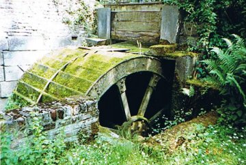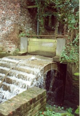 - Metalen bovenslagrad met houten armen en schoepen, 3 m diameter, 2,50 m breed