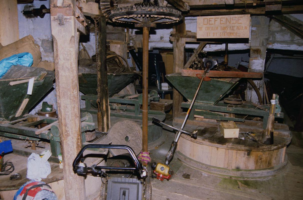 Het bovenslagrad is van eikenhout, is 3 m X 1,60 meter groot, telt 36 schoepen en is geplaatst op het uiteinde van een eikenhouten wateras van 5,32 meter lengte. Er zijn drie steenkoppels (één voor broodmeel en twee voor veevoeder) en een haverpletter.