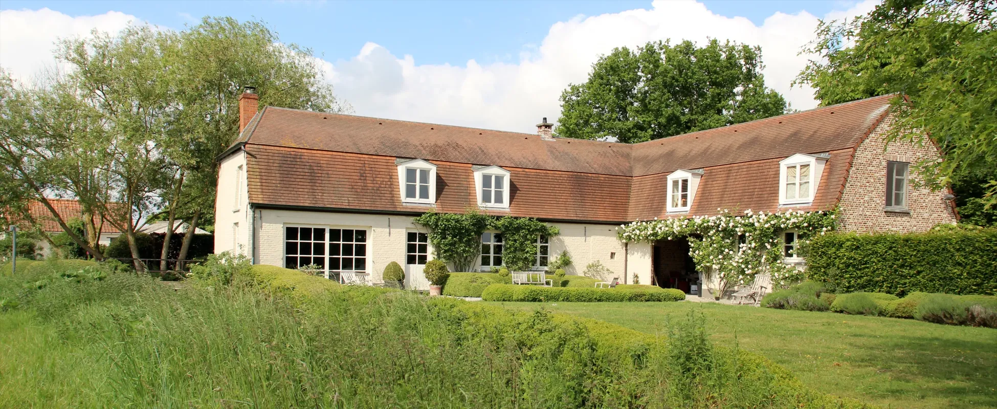 Langgestrekt boerenhuis achterin aan de Molenbeek en toegankelijk via ijzeren brugje. Zeven traveeën en één bouwlaag onder deels afgewolfd mansardedak met twee gootlijsten, bedekt met pannen. Verankerde bakstenen gevel, gedeeltelijke gewit op hardstenen plint met rechth. muuropeningen en één getralied venster in de achtergevel. Van de watergraanmolen herinneren nog de vaag zichtbare sporen van gedichte muuropening op de rechter zijgevel aan de Molenbeek.