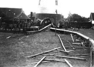 Enkele maanden later gebeurde de catastrofe. Het was 13 oktober 1932, zeven uur in de morgen, er stond een goede wind en de molen draaide lustig. Opeens stak er een windhoos op. Gaston stond op de molen en in enkele seconden was het gebeurd. Vooraleer men de molen kon vangen sloeg de kap om en plofte met een zware slag naar beneden. Sommige delen werden tientallen meters ver geslingerd.