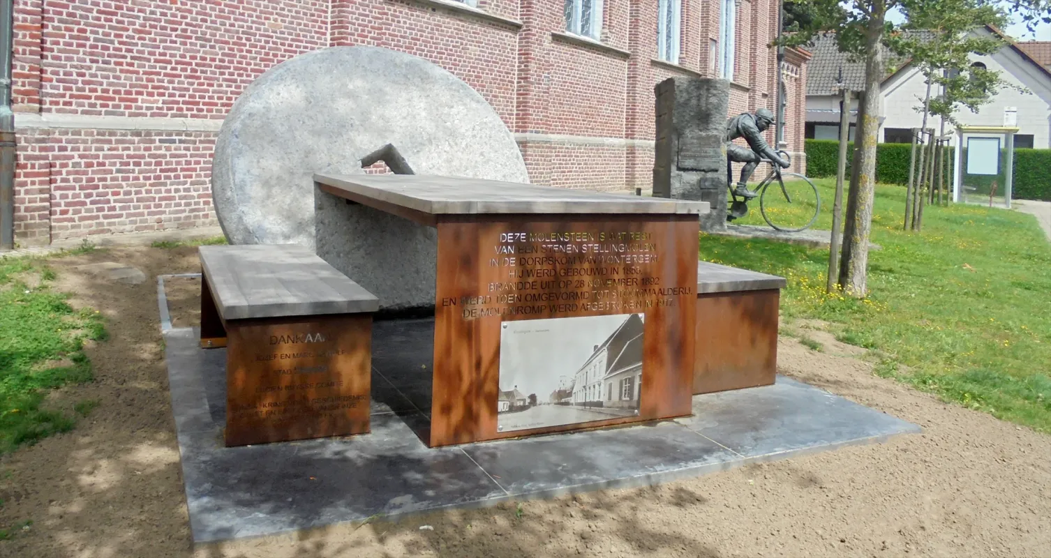 Inzender schrijft: "De molensteen waarvan sprake is in de tekst is ondertussen geplaatst bij de Sint-Agneskerk van Wontergem (Deinze) naast het standbeeld van de beschreven wielrenner Lucien Buysse die in 1926 de Ronde van Frankrijk won. Hij zou in de maalderij gewerkt hebben. Nadien kwam er een melkerij op de plaats van de molen, en vandaag zag ik een gele brief hangen met een aanvraag voor volledige afbraak."