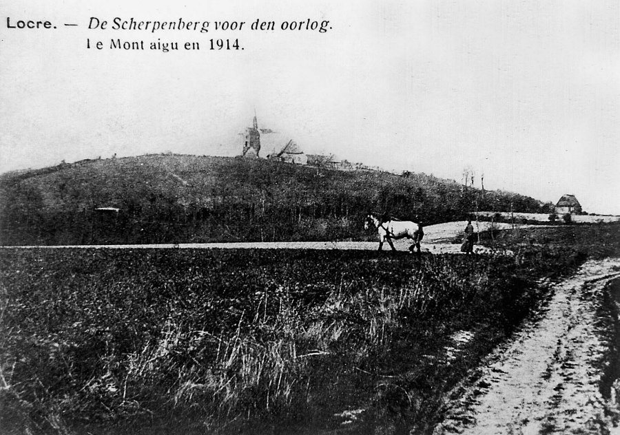 Tijdens de Eerste Wereldoorlog kampeerden Engelse soldaten bij de Scherpenberg. Op een foto van november 1917, bewaard in het Imperial War Museum te Londen, zien we nog de molen en het molenhuis op de top van de Scherpenberg. De wagens vooraan zijn veldkeukens. Het eten werd te velde klaargemaakt. De bereiding gebeurde met houtskool want rook zou de aandacht van de tegenstander trekken...