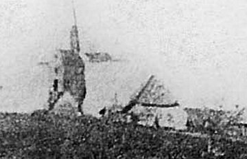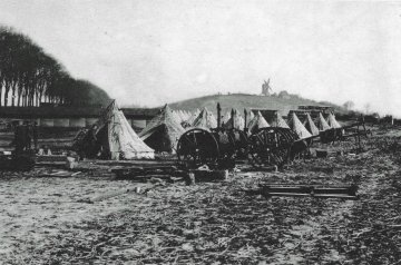 Een andere opname uit november 1917 toont een Engels tentenkamp met gecamoufleerde legertenten aan de voet van de heuvel, met veldkeukens op de voorgrond. De molen draaide er lustig op los met gezwichte zeilen, alsof de oorlog ver weg was.