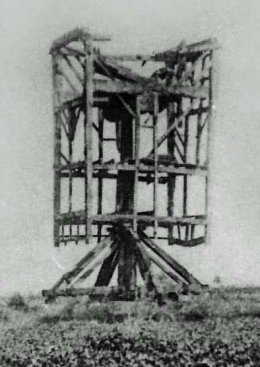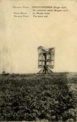 Op een bewaarde prentkaart, naar een oorlogsfoto van augustus 1916, zien we de vernielde molen. De geblakerde molenkast, zonder wiekenkruis, trap, binnenwerk en beplanking, staat toch nog op het gebint. De molenas ligt uitgezakt op de bovenste zolder. Het bijschrift luidt: "Belgisch Front OOSTVLETEREN (Oogst 1916) De verbrande molen (August 1916) Front Belge Le Moulin brûlé Belgium Front The burnt mill".