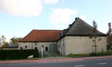 Haakse vleugel onder zadeldak (pannen) met schild, uit dezelfde tijd. Breuksteenbouw; drie rondboogdeurtjes, een verankerde gelijkvormige schuurpoort en vierkante vensters in vlakke zandstenen omlijstingen. In de achtergevel, zandstenen rondboogpoort van de dwarsschuur. Tegen de zijgevel, bijgebouw uit de 19de eeuw.