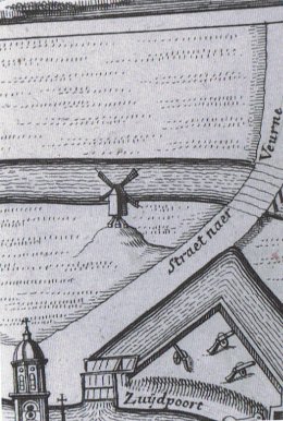 Er bleef een foto van ca. 1880 bewaard, met rechts de molen in werking (met vier volle zeilen) en links de Tempeliers- of St.-Laurentiustoren (in de volksmond "Duvetorre") aan de huidige Willem de Roolaan, waarvan de puinen nog bestaan. Het was een verbouwde toren van de vroegere St.-Laurentiuskerk (13de eeuw).