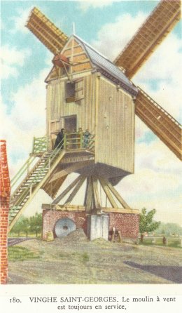 Chromo in: Henri Liebrecht, Quelques Traditions et Coutumes du Folklore Belge, volume 2, Bruxelles (Côte d'Or, Usines Alimenta, Rue Bara, 40), 1950. Onderschrift: Vinghe (sec) Saint-Georges. Le moulin à vent est toujours en activité. De tekenaar was lid van de l'Académie Royale de Langue et de Littérature Français). De chromo's konden ingekleefd worden.